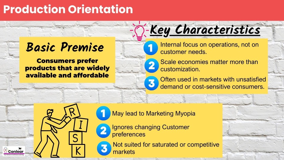 Production orientation is a historically significant marketing philosophy that emphasizes operational efficiency, cost leadership, and broad accessibility. While it laid the foundation for mass market success during the industrial and early post-industrial eras, its limitations in addressing dynamic customer preferences have become increasingly evident. In today’s world, while elements of production orientation remain useful, especially for cost-sensitive markets, they must be blended with modern marketing approaches that put the customer at the center.