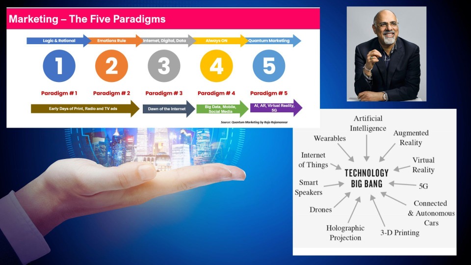 The fifth paradigm, known as Quantum Marketing, is ushered in by a significant leap in technology. Infinite data, Artificial intelligence, blockchain, 5G, Virtual reality, augmented reality, and 3D Printers will dramatically change how consumers engage with brands and make purchasing choices.