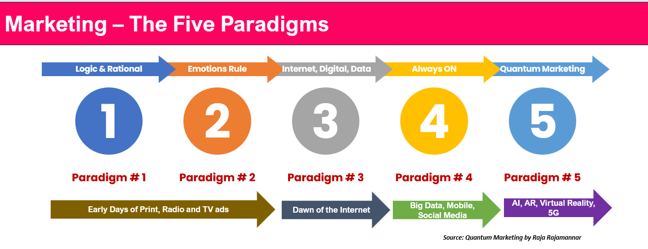Raja outlines the evolution of marketing through what he identifies as four distinct paradigms, leading up to the current, fifth paradigm. Each paradigm marks the advent of path breaking technologies or changes in consumer behaviours (or both):